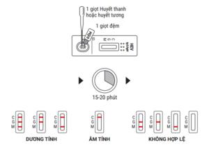 DƯƠNG TÍNH IgM: Xuất hiện hai vạch màu: một là vạch chứng C và một là vạch kết quả M (IgM). Kết quả cho thấy mẫu phẩm chứa kháng thể IgM và không chứa kháng thể IgG kháng HEV.